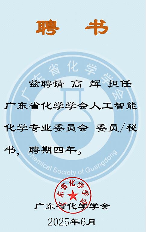 高辉教授担任广东省化学学会人工智能化学专业委员会委员/秘书。