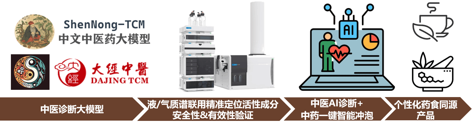 具体的,基于中医诊断大模型,结合各类液相/质谱和气相/质谱联用仪,精准定位活性成份并验证其安全性与有效性,实现中医AI诊断与中药智能冲泡的一站式快速联动,开发个性化的药食同源健康产品(如个性化凉茶饮品等)。